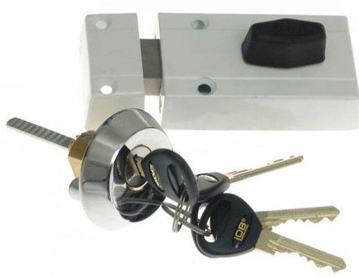 Zamek wierzchni bębenkowy zasuwkowy, uniwersalny z wkładką. Odległość otworu na wkładkę bębenkową do czoła zamka 60mm. Przez naczony do drzwi o grubości 32-64mm